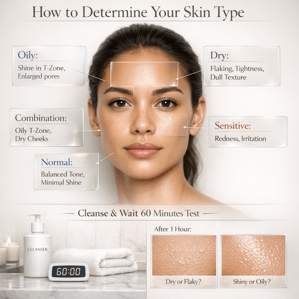 Determining your skin type is essential for selecting appropriate skincare products and establishing an effective routine. Here’s how you can identify your skin type:
